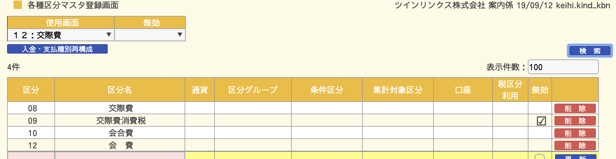 (2019.09.11更新)・区分:コード値(自動仕訳設定マスタ上の「中区分」と連動します)・区分名:画面の選択肢として表示される名称です・通貨:通貨コード・区分グループ:回収予定表や回収明細表などでグループ化するためのキーです・条件区分:各種処理において処理条件として利用されます・集計対象区分:末残の集計対象区分になります・口座:入金種別にて利用される口座を指定します・税区分利用:入金種別が税区分を利用する場合は有効にします・無効フラグ:入金種別を選択肢として表示させないようにする場合はチェックします(過去に利用されているものを表示する必要があるので基本削除はしません)※「口座マスタ」に口座を登録している場合は、標準で使われる「入金種別」「支払種別」を自動生成する機能が利用できます。■ 機能概要以下のルールに従って、初期データが生成されます。・011 <= cd < 099 : 売掛(買掛)と口座間での相殺をする種別・481 :・511 <= cd < 599 : 前受(前渡)と口座間での相殺をする種別・711 <= cd < 799 : 仮受(仮払)と口座間での相殺をする種別・911 <= cd < 997 : 外貨建ての売掛金を通貨替(円転)する際の受入口座を指定する種別上記のコード帯は一度初期化(削除)され、口座の数分データが作成されます。上記に加え末尾2桁で以下の構成をします。・x11 : 振込・x12 : 送金・x13 : 自振(支払種別のみ)・x15 : 小切手※911 については、上記のx12等は生成されません。上記+通貨(現行はJPYとUSDのみ)をつけたものが各種別になります。例)口座:みずほ東京、三菱UFJ大阪→011売掛みずほ東京振込¥、011売掛みずほ東京振込$012売掛みずほ東京送金¥、012売掛みずほ東京送金$511前受みずほ東京振込¥、511前受みずほ東京振込$512前受みずほ東京送金¥、512前受みずほ東京送金$711前受みずほ東京振込¥、711前受みずほ東京振込$712前受みずほ東京送金¥、712前受みずほ東京送金$ 等1)メニュー:「会計管理タブ」>「各種区分マスタ登録」