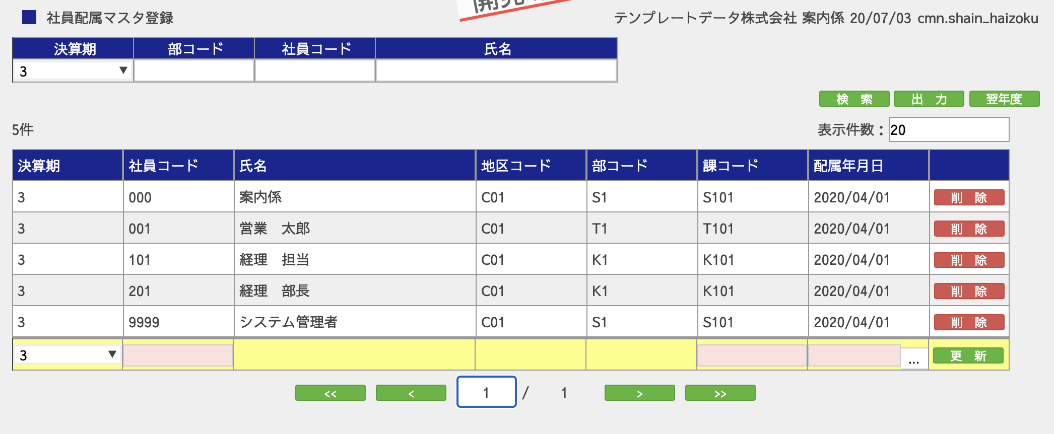 ・概要社員マスタではその社員がどの組織に在籍しているかを登録しません。かわりに本画面にて社員を配属します。各入力画面で必須となっている地区や部、課が特定できないため配属は必須 になります。・登録手順・「管理者タブ」>「社員配属マスタ登録」をクリックして画面を開きます。・「決算期」を選択してその期の配属を指定します。・入力欄が赤くなっている項目は必須です。※社員コードは、社員マスタから、課コードは、組織名マスタから参照して選択します。ただし、課コードは、組織構成マスタで構成さていないと選べませんので注意が必要です。